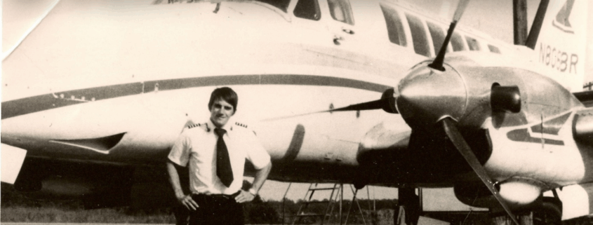 The author in 1975 standing in front of the same Beech 99,N8068R,that experienced an engine explosion on takeoff. Note the inboard turbine exhaust nozzles aimed at a 45-degree angle to the fuselage. Broken turbine blades exited the right engine’s inboard exhaust nozzle striking the fuselage just below where the author was sitting in the right cockpit seat.