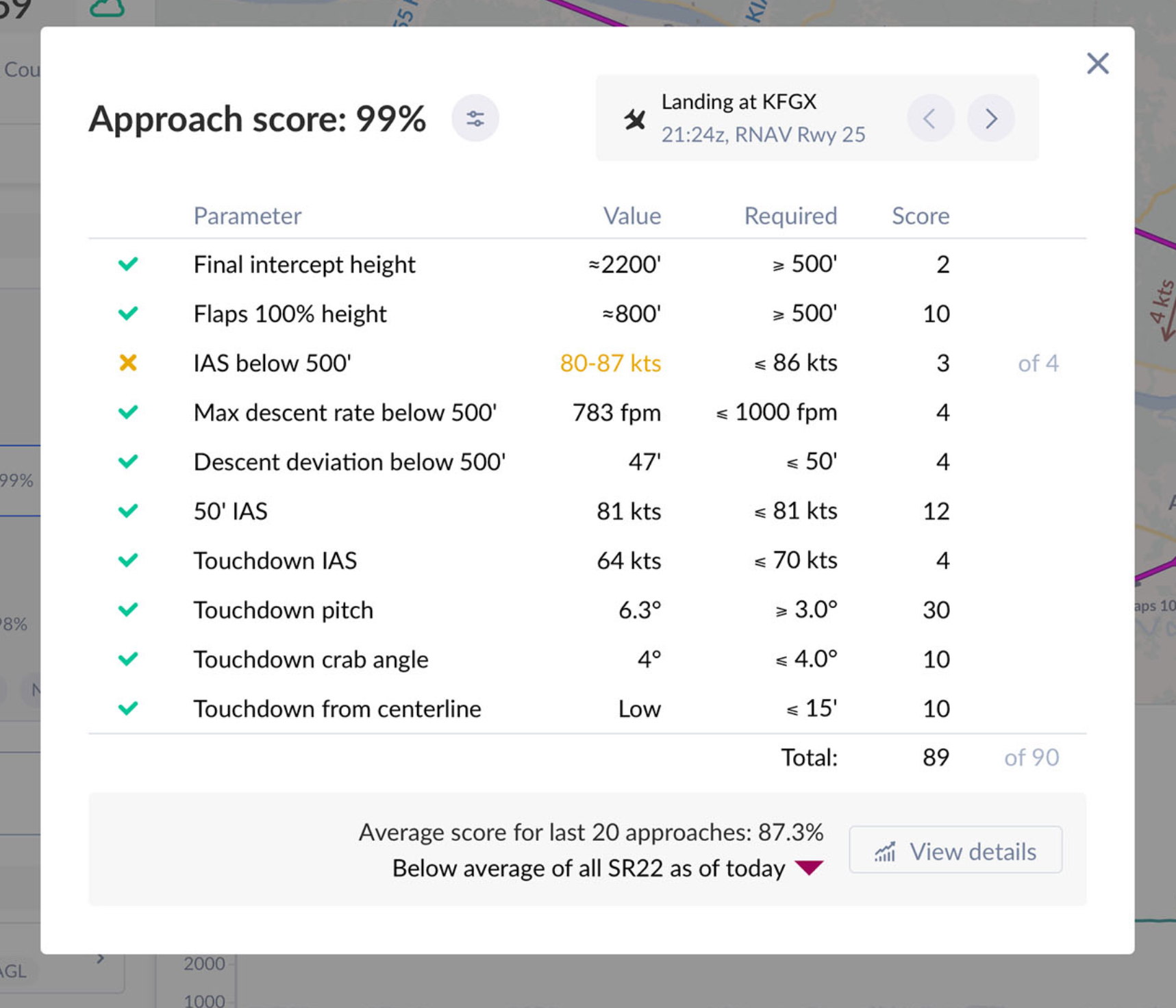 I’ve been particularly impressed with FlySto, which delivers an approach score for every flight that summarizes airspeed control, descent rate, pitch angle, and centerline drift. It even compares your flight to an average of other FlySto pilots who fly the same aircraft type. There is nowhere to run and nowhere to hide with this free app: if you flew a bad approach, you will see it clearly.