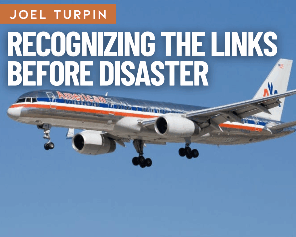 The first link in the chain occurred three years prior to the accident, when terrorists blew up the Cali, Colombia, airport’s radar antenna, which was never repaired. This meant the crew would be flying the arrival route down a valley, at night, between two mountain ranges, below their peaks, and not in radar contact.