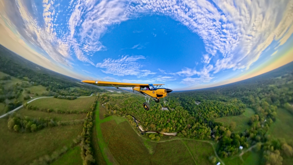 The memory: A flight to explore some of the backcountry strips around Northwest Arkansas did not go exactly as planned. Winds were stronger than expected, and they were swirling in the hills. Most of the strips I planned to visit were blown out. I do this for fun, and these landings would not have been fun. So, I just spent a couple of Hobbs Hours flying around and seeing the sights. Sometimes, the best sight is in the sky above.  Mother Nature provided a circle of clouds above to frame the Cub and the Arkansas landscape. Surprise shots like these make the marriage of photography and flying worthwhile.
